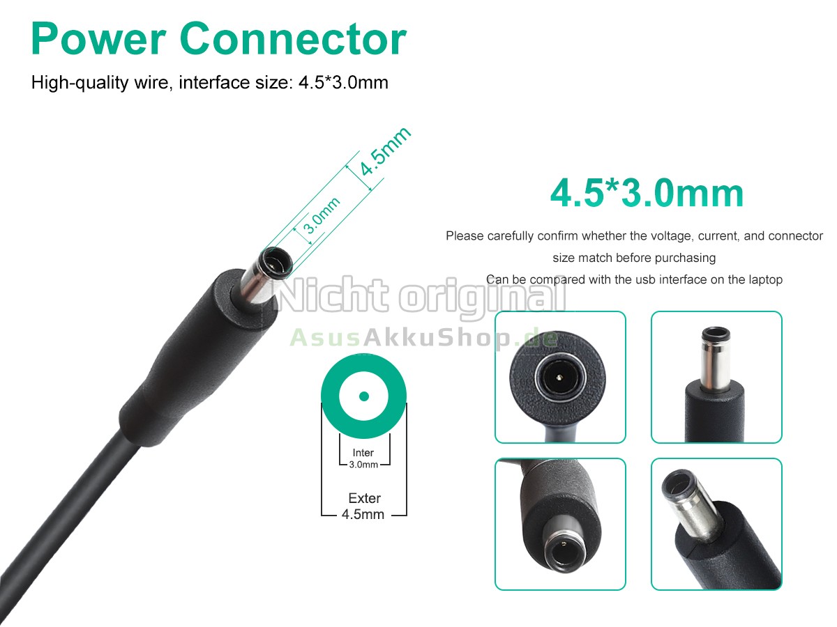 Achten Sie einfach auf die Ausgangsparameter und den Steckertyp. Die Ausgangsspannung sollte gleich oder nicht mehr als 1V anders als Ihr Original Netzteil für Asus Vivobook 15X 14X 16X 17X K1703ZA K1703Z M1703Q M1703QA K1703ZA sein, und der Ausgangsstrom sollte etwas größer oder gleich dem Ihres Originaladapter sein. Was den Anschlusstyp betrifft, stellen Sie sicher, dass er in den Ladeanschluss Ihres Geräts eingesteckt werden kann. Wenn Sie die Größe des Steckers nicht einschätzen können, können Sie uns mit Ihrem Laptop-Modell kontaktieren.