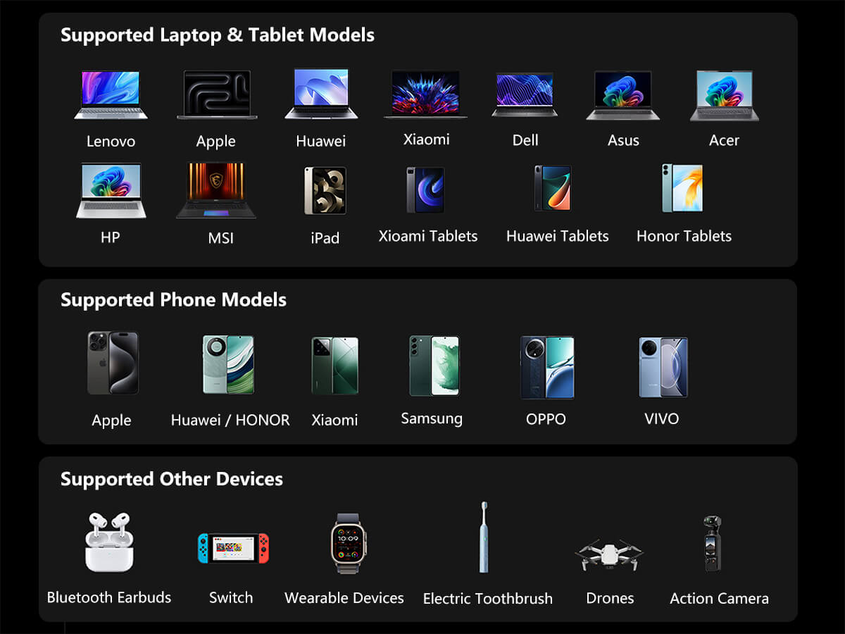 Ja. Die Powerbank ist universell kompatibel mit Apple, Samsung, Google und weiteren Marken. Sie unterstützt neben PD 3.0 auch diverse andere Schnellladeprotokolle, sodass Sie problemlos ein Laptop, ein Tablet und ein Smartphone verschiedener Hersteller gleichzeitig mit Strom versorgen können.